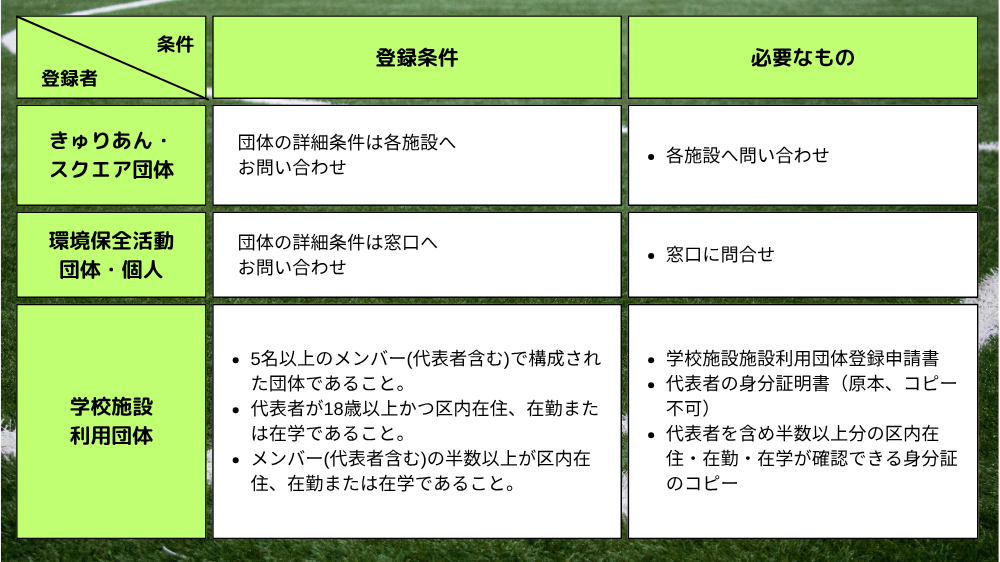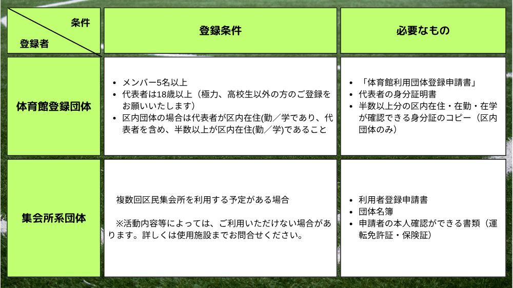 - 登録種目と最低必要人数を満たす事 ※同一種目で複数の団体への登録不可。 テニス4名/野球10名/サッカー(フットサル・ミニサッカー)12名/こどもサッカー10名/多目的広場6名 ※こどもサッカーの必要最低人数は、代表者1名、小学生9名