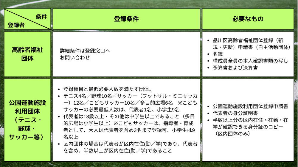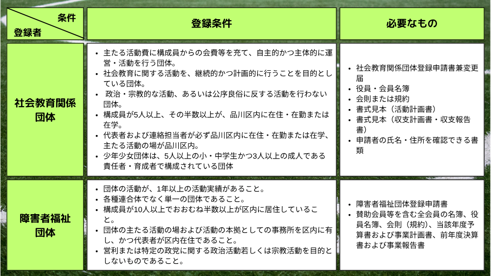 - 構成員が5人以上であり、その半数以上が、品川区内に在住・在勤または在学している団体。 ※家族だけで構成されている団体は登録できません。 ※同じ活動内容(ジャンル)での重複登録はできません。