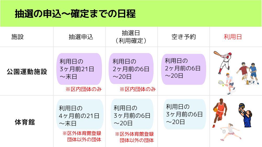 - 区外体育館登録団体以外の団体 抽選申込:利用月の4カ月前の21日~末日